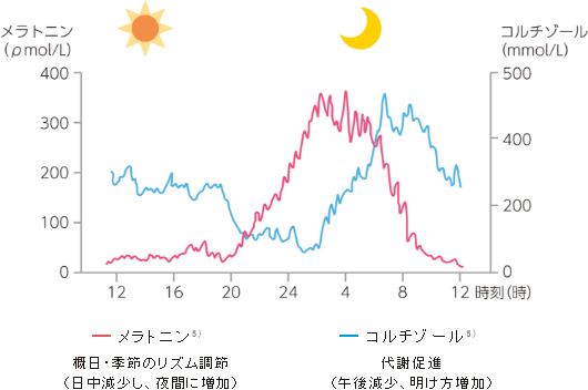 コルチゾールは睡眠中にゆっくり分泌され、起きる直前にピークになります。コルチゾールが適切な量まで増えることで気持ちのいい目覚めがあります。そして、目が覚めてから、コルチゾールが減り始めて、就寝前にはメラトニンが優位になって、健やかな入眠があります。