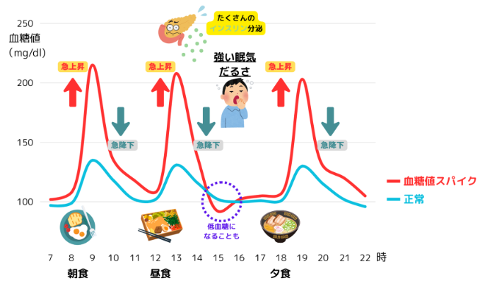 血糖値スパイクとは、食後の血糖値が急上昇と急降下を起こす状態のことです。肥満や老化などの影響でインスリンを分泌する能力が低下すると、ブドウ糖を細胞内に適切に取り込めなくなり、血糖値が急上昇して血糖値スパイクが起きやすくなります。血糖値スパイクの状態になると、急上昇した血糖値に対応しようとしてインスリンが過剰に分泌され、一気に低血糖状態になることで眠気やだるさを感じることがあります。森下仁丹HPより |